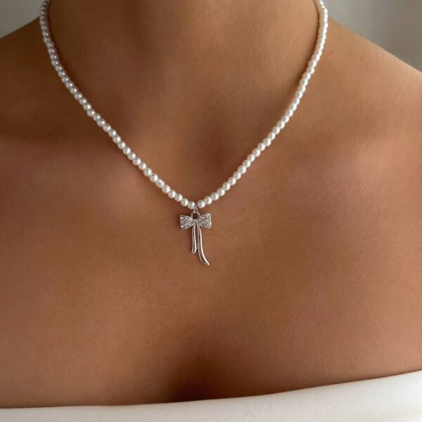 گردنبند مرواریدی آویز پاپیون نگینی
